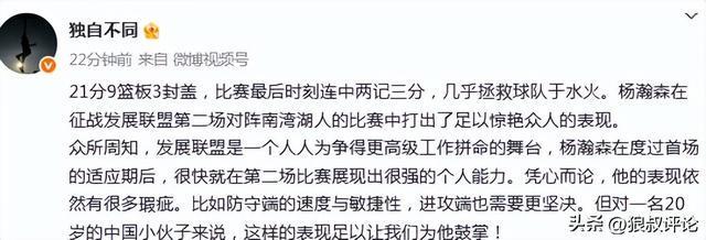 青岛记者杜金城发文点评:“21分9篮板3封盖,比赛最后时刻连中两记三分,几乎拯救球队于水火。杨瀚森在征战发展联盟第二场对阵南湾湖人的比赛中打出了足以惊艳众人的表现。